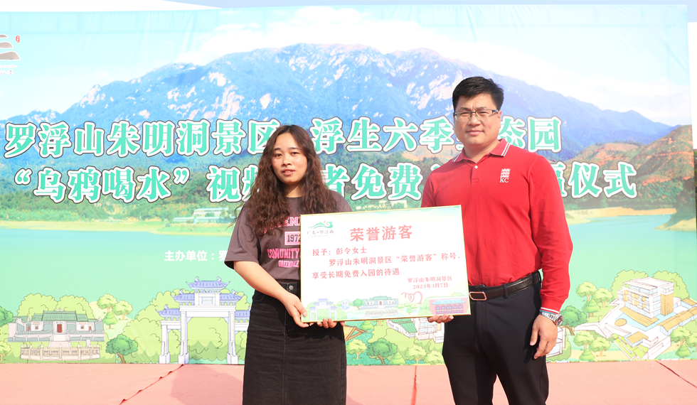 羅浮山朱明洞景區(qū)授予“烏鴉喝水”視頻作者彭令免費(fèi)入園牌匾。