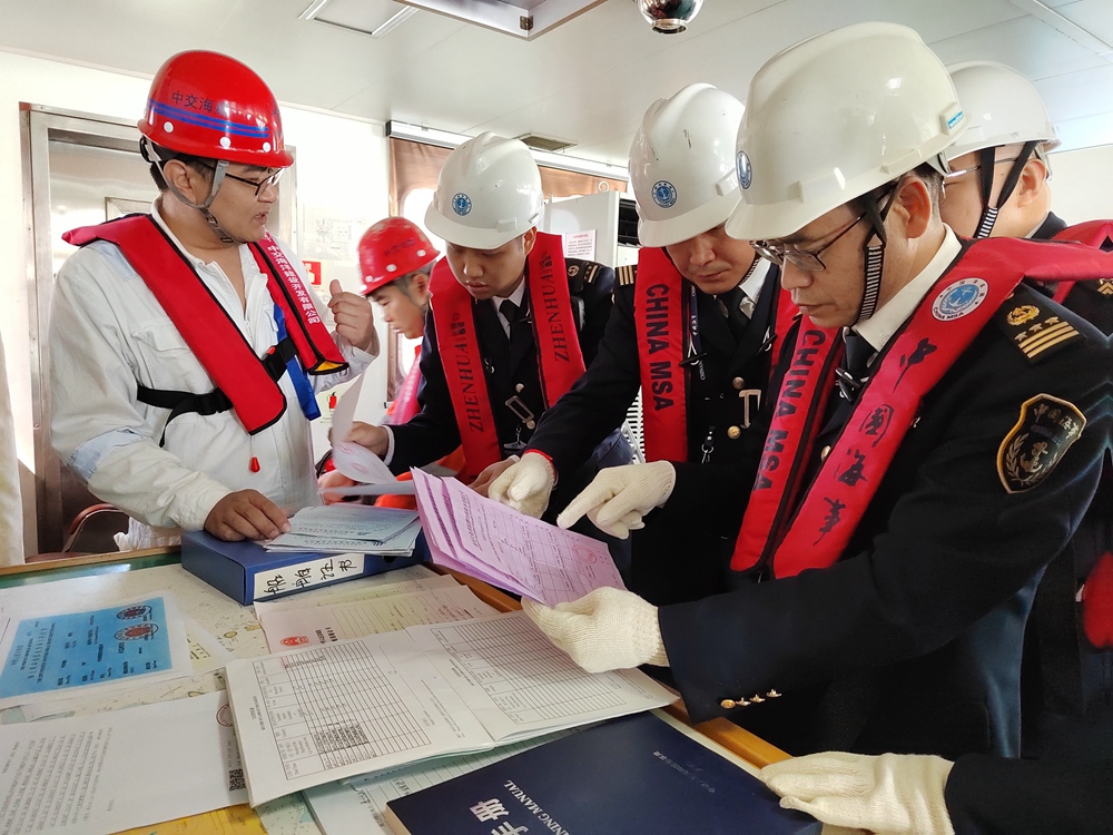 在荃灣港區(qū)、1號錨地、荃灣航道、東聯(lián)施工作業(yè)區(qū),海事執(zhí)法人員對船舶證書文書、船舶配員、施工許可證、進出港報告、安全設備狀況開展仔細檢查,針對發(fā)現(xiàn)的問題,督促施工方立即整改。