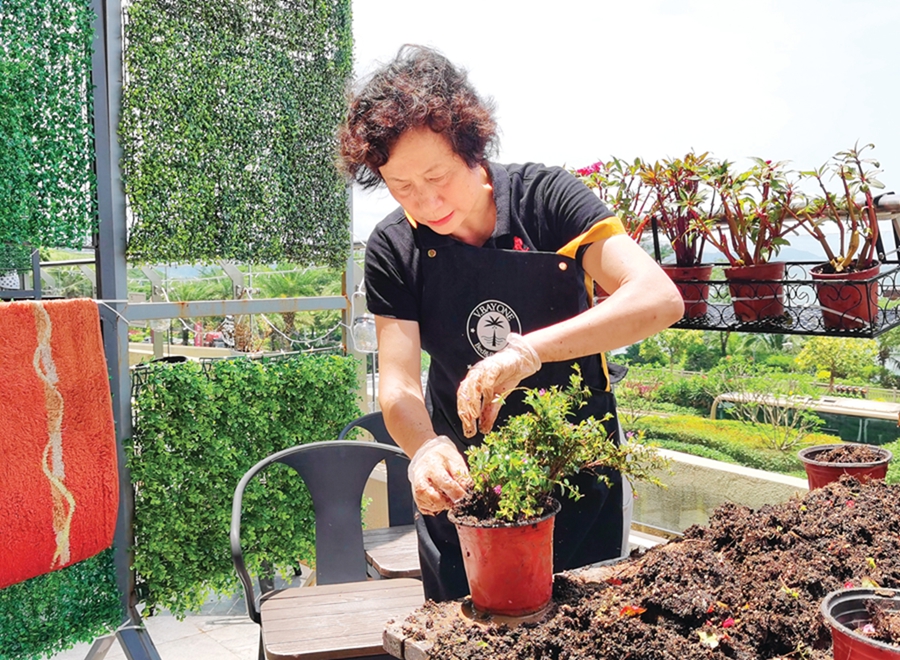 石蕙在打理花草。