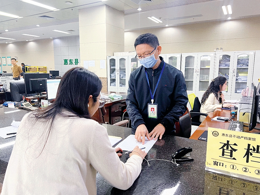 工作人員為前來咨詢辦理不動產(chǎn)流程有關(guān)事宜的群眾耐心答疑。