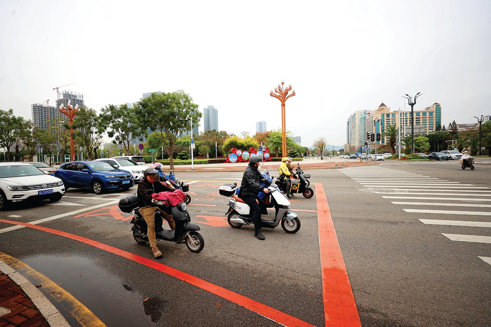 在市區(qū)麥地路花邊嶺廣場路口,隨著往返麥地路方向紅燈亮起,不少電動自行車有序停在路口內(nèi)設(shè)置有紅色標線的電動自行車等候區(qū)。等候區(qū)后面主干道上,則是依次停車等候的機動車或電動汽車。不久,綠燈亮起,只見等候區(qū)電動自行車先行啟動,接著是機動車隨后行駛,整個交通秩序安全又文明。
