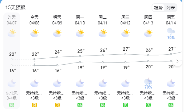 具體來(lái)說(shuō),今天白天,陰天到多云,最高氣溫22℃左右;9-10日,多云天氣為主,氣溫16~25℃;11-12日,多云到陰天,氣溫18~27℃;13-15日,多云到陰天,局部有陣雨。