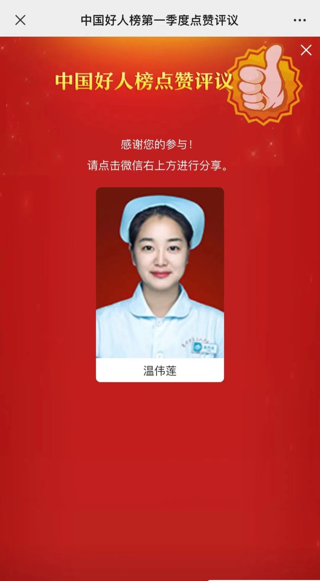 惠城區(qū)共有1名候選人參與此次點(diǎn)贊評議活動,快動動手指為我區(qū)溫偉蓮點(diǎn)贊吧!