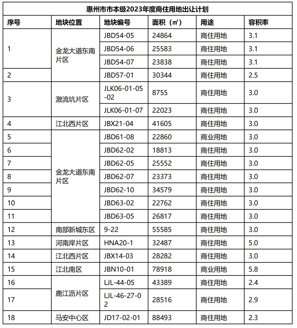 根據(jù)今年2月份市自然資源局發(fā)布的《惠州市2023年度第一批次國有建設用地擬出讓詳細地塊清單》,金龍大道東南片區(qū)JBD54-05、JBD54-06、JBD54-07地塊擬將于6月份之前聯(lián)合出讓,用地面積約7.42萬平方米,容積率為3.1;最大計容建筑面積23.02萬平方米。
