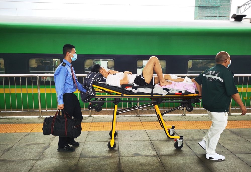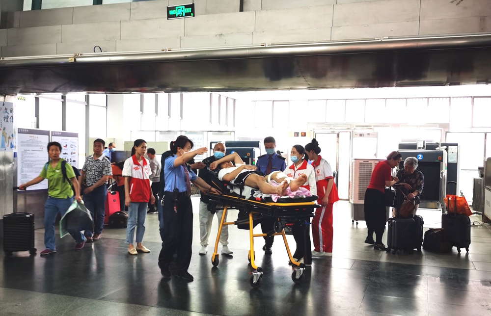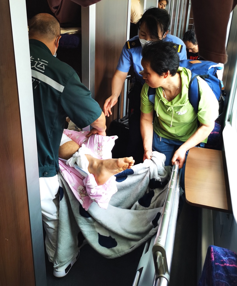 隨后,王奇磊迅速做好安排,并為該旅客臨時(shí)協(xié)調(diào)了一張下鋪。120救護(hù)車到達(dá)惠州火車站廣場(chǎng)后,王奇磊立刻協(xié)助醫(yī)護(hù)人員和家屬將旅客推下救護(hù)車,并安排客運(yùn)員吳威成幫助旅客提拿行李。從進(jìn)站、安檢到站臺(tái),惠州火車站一路開(kāi)行“綠色通道”,保障該旅客順利上車,全程用了不到20分鐘,旅客及其家屬連連道謝。