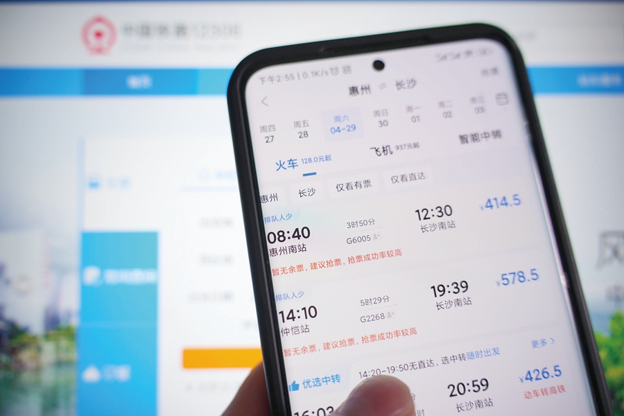“五一”假期惠州往長(zhǎng)沙方向多趟車(chē)次車(chē)票顯示售罄。