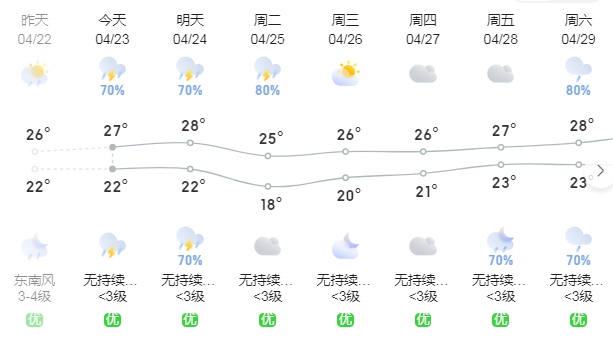 23-24日,陰天間多云,有分散(雷)陣雨,氣溫22~28℃;