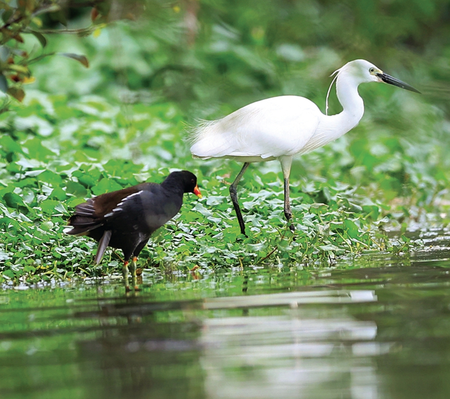 黑水雞與小白鷺一同覓食。
