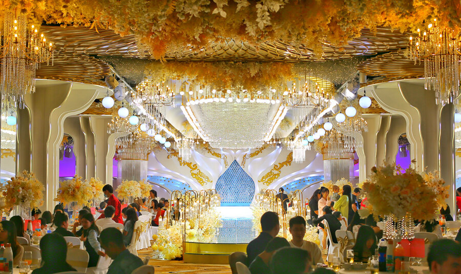 對金華悅、天悅、康帝、珀?duì)柭茸漪[市區(qū)的酒店而言,如何在室內(nèi)場所為求新穎、求個(gè)性的年輕人提供一個(gè)滿意的婚禮婚宴,是他們共同面對的新形勢。“以前訂婚禮擺酒,更多是新人跟著爸媽來,幾乎一訂一個(gè)準(zhǔn)。現(xiàn)在更多是年輕人自己來,新人拿主意。”羅永玲說,金華悅沒有戶外場地,此前婚宴廳是根據(jù)新人預(yù)算、桌數(shù)等預(yù)訂,年輕人對婚禮品質(zhì)的追求使得金華悅作出改變、自救。“我們到上海、江蘇、安徽等地學(xué)習(xí),2021年確定打造婚禮堂。”當(dāng)年9月底,金華悅推出藍(lán)色水晶廳、金色金禧廳兩大婚禮堂,布置了主題場景、絢麗燈光和音樂,新人不需要請婚慶策劃公司設(shè)計(jì)、布置場地,酒店就能為新人提供夢幻般婚禮。