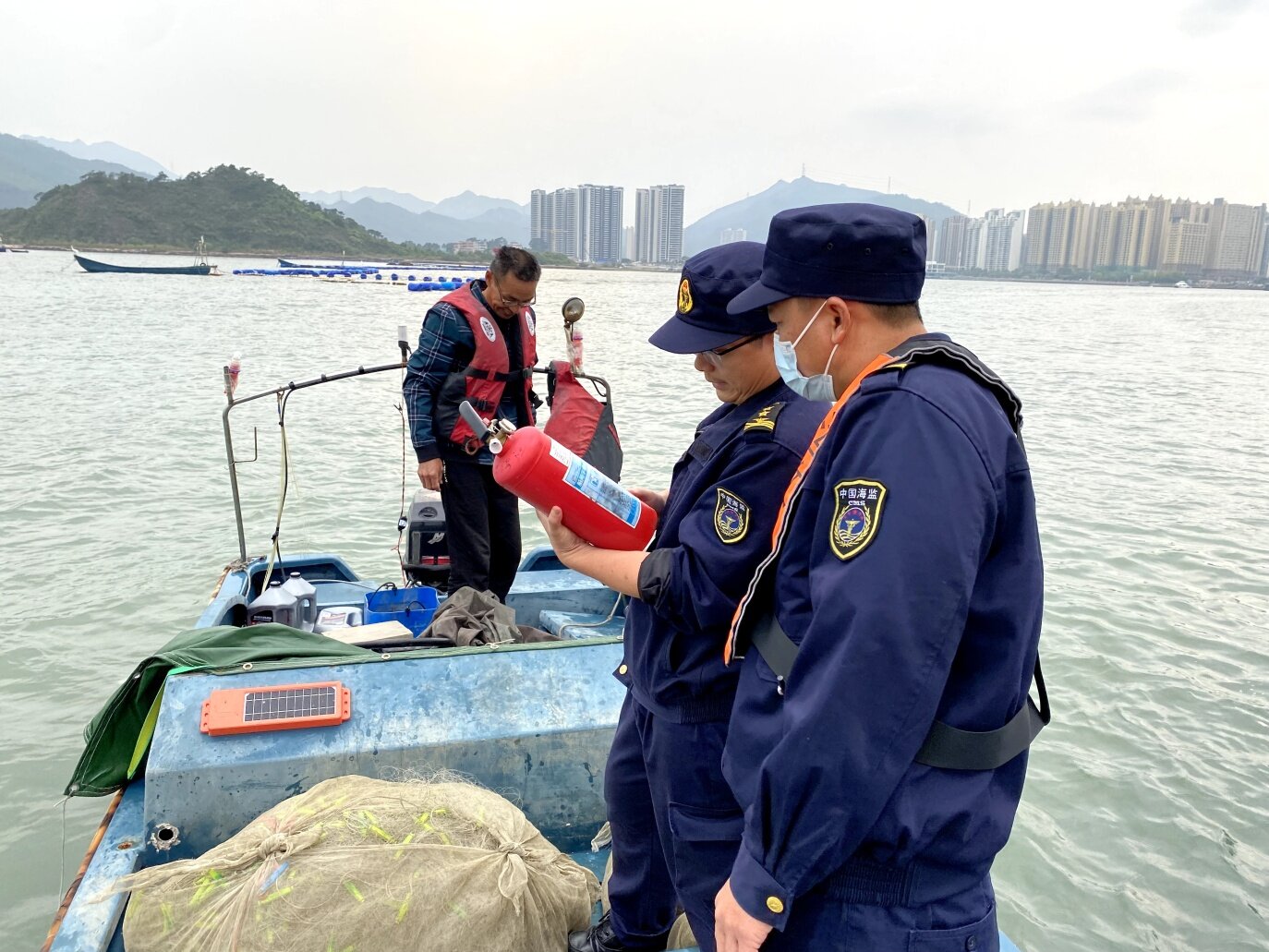 海洋綜合執(zhí)法人員檢查漁船設(shè)備,做好休漁安全監(jiān)管工作。