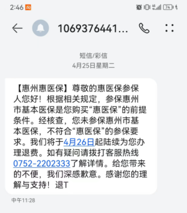 市民反映:已購買2023年“惠醫(yī)保”收到短信提醒“退費(fèi)”