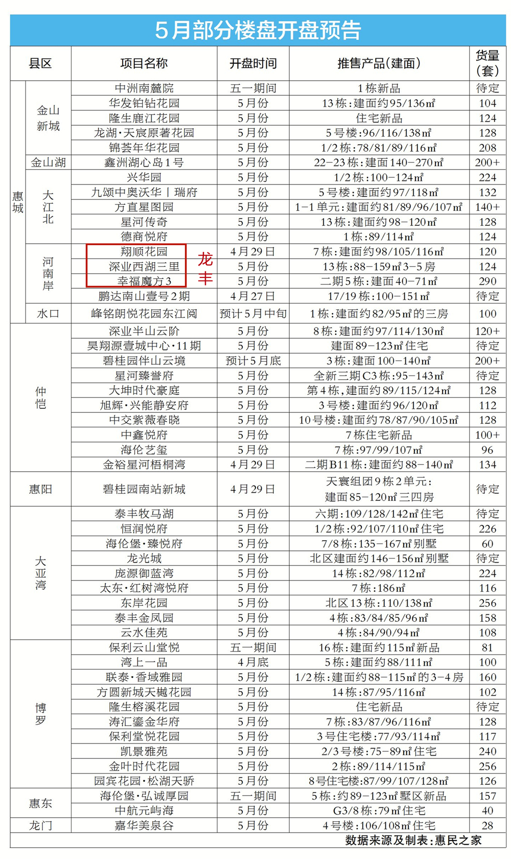 通過開展“宜居惠州 安家惠城”明星樓盤惠民購房節(jié)暨辦證抽大獎等活動,“五一”期間惠城區(qū)熱點在售樓盤日均到訪量和認購量環(huán)比上行明顯。市場成交活躍,進一步帶動了開發(fā)商的推貨熱情。惠民之家數(shù)據(jù)監(jiān)控中心統(tǒng)計顯示,惠城本月預計將有16盤推新,超2300套新房入市,新品主要集中在金山新城、江北及河南岸3個片區(qū)。