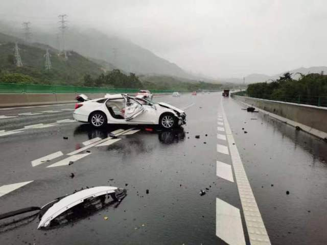惠州市公安局交警支隊高一大隊警員進(jìn)行視頻巡查時,在G15沈海高速公路汕頭2790公里處發(fā)現(xiàn)一輛白色轎車損傷嚴(yán)重,橫放在路上,正值下雨天能見度降低,情況十分危急,隨即通知附近巡邏警力和救援單位趕赴現(xiàn)場處置,防止二次事故發(fā)生。