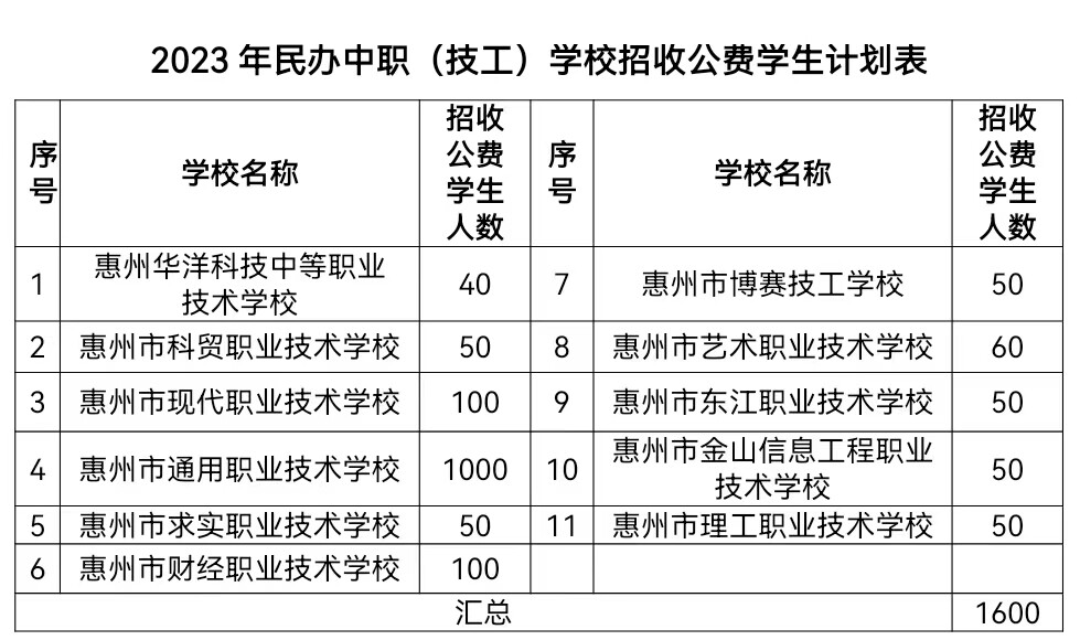 答:一是從2015年春季學(xué)期起,國家對就讀中職、技工院校的所有農(nóng)村(含縣鎮(zhèn))戶籍學(xué)生和城市涉農(nóng)專業(yè)學(xué)生及家庭經(jīng)濟困難學(xué)生免除3年學(xué)費(藝術(shù)類相關(guān)表演專業(yè)除外,民辦學(xué)校可以補收差額學(xué)費)。二是從2015年春季學(xué)期起,國家對全日制正式學(xué)籍一、二年級涉農(nóng)專業(yè)學(xué)生和非涉農(nóng)專業(yè)家庭經(jīng)濟困難學(xué)生每人每年補助生活費2000元。三是今年我市有11所民辦中職、技工院校參照《惠州市市屬公辦職業(yè)院校生均基準(zhǔn)定額標(biāo)準(zhǔn)》招收公費生,具體招生條件詳詢招生院校。公費生招生計劃見下表: