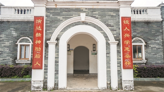 站在教學樓前,首先看到的是新門樓對聯(lián)“鏡人興學惠桑梓;演達精神勵后人”,木刻的對聯(lián)古香古色,細細品味,兩代人的精神縈繞其上、延綿不斷,讓人連聲稱贊;抬頭仰望,門樓山墻上鄧鏡人所題的楹聯(lián)“培植資時雨;英雄起草茅”鑲嵌其間,至今仍熠熠生輝、秉燭大地。拱券門窗、羅馬立柱、中式竹節(jié)欄桿等中西建筑元素相結(jié)合,整座建筑看起來端莊厚重、歷久彌新。