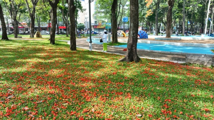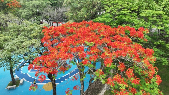 火紅的鳳凰花開滿枝頭,與公園藍色的運動休閑地相映成趣。