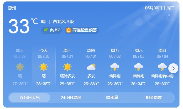 惠州日報訊 (記者周智聰)5月29日,惠州市氣象臺發(fā)布惠州一周天氣趨勢,預(yù)計本周前中期我市高溫炎熱天氣持續(xù);后期雷雨趨于頻繁,高溫有所緩解。