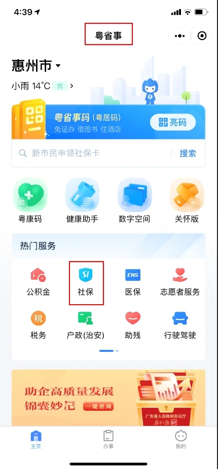 第一步:打開(kāi)微信搜索“粵省事”找到“社保”登錄個(gè)人賬戶。