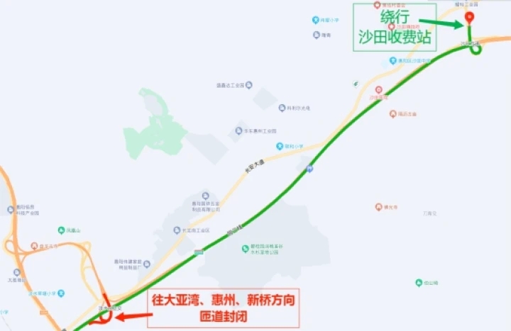 惠大高速經(jīng)淡水東互通轉(zhuǎn)沈海高速(往汕頭方向)車輛,可提前從淡水東收費站駛出,繞行228國道至沈海高速沙田收費站駛?cè)搿?