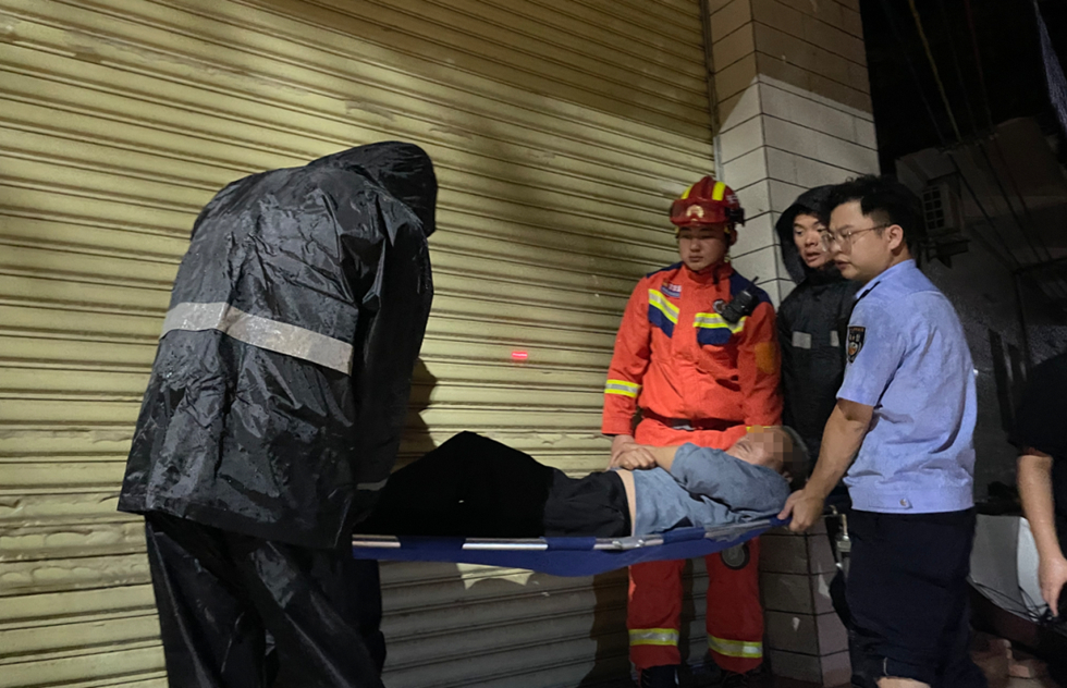 在當?shù)嘏沙鏊窬瘏f(xié)助下,消防員克服惡劣天氣和燈光照明不足、雨水暴漲等困難,經(jīng)過半小時緊急救援,成功將老人轉移至安全地帶。