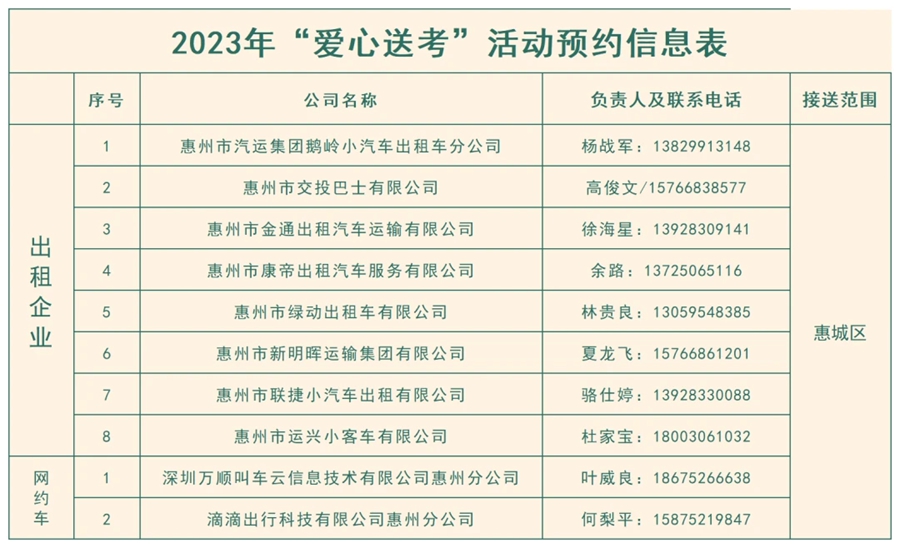據(jù)了解,除了公交車(chē),我市10家出租車(chē)和網(wǎng)約車(chē)公司也加入愛(ài)心送考行列,廣大考生也可預(yù)約出租車(chē)和網(wǎng)約車(chē),享受“點(diǎn)對(duì)點(diǎn)”服務(wù)。沒(méi)有預(yù)約的考生,也可憑準(zhǔn)考證免費(fèi)乘坐系有愛(ài)心綠絲帶或擋風(fēng)玻璃貼有“愛(ài)心送考”標(biāo)志的公交車(chē)、出租車(chē)和網(wǎng)約車(chē)。