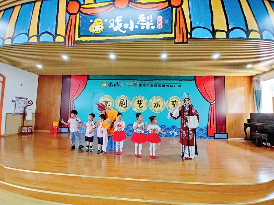 據(jù)國(guó)務(wù)院辦公廳印發(fā)《關(guān)于支持戲曲傳承發(fā)展的若干政策》以及中宣部等部門(mén)聯(lián)合下發(fā)《關(guān)于戲曲進(jìn)校園的實(shí)施意見(jiàn)》等文件精神,近些年,各地對(duì)“京劇進(jìn)校園”進(jìn)行了深度實(shí)踐與探索。如從兩年前開(kāi)始,惠城區(qū)惠外幼兒園依據(jù)幼兒的學(xué)齡特點(diǎn),將京劇藝術(shù)整合滲透到幼兒學(xué)習(xí)生活,陶冶藝術(shù)情操,浸潤(rùn)心靈,獲得更好的發(fā)展。