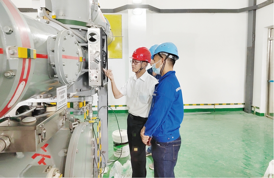 李鴻文(左一)在變電站現(xiàn)場(chǎng)查看調(diào)控一體化相關(guān)工業(yè)傳感器安裝情況。