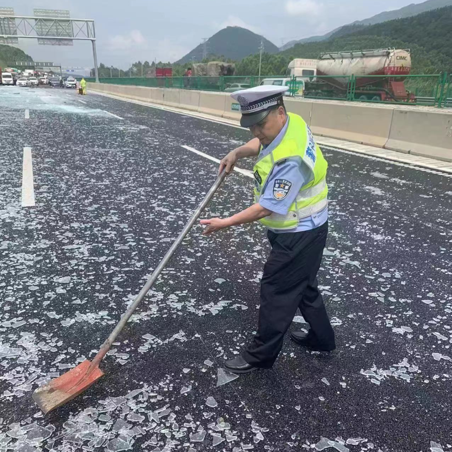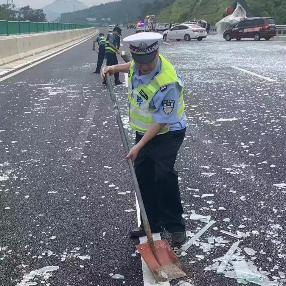 不久后,養(yǎng)護(hù)部門、拯救車輛陸續(xù)到達(dá),民警協(xié)同施救人員一起對(duì)現(xiàn)場(chǎng)進(jìn)行清理,冒著烈日高溫,利用鐵鏟、掃把等工具第一時(shí)間清理出一條安全車道供車輛行駛。繼續(xù)不停歇地打掃2小時(shí)后,路面上所有的碎玻璃及其他障礙物最終被徹底清理干凈,道路也恢復(fù)了正常通車。
