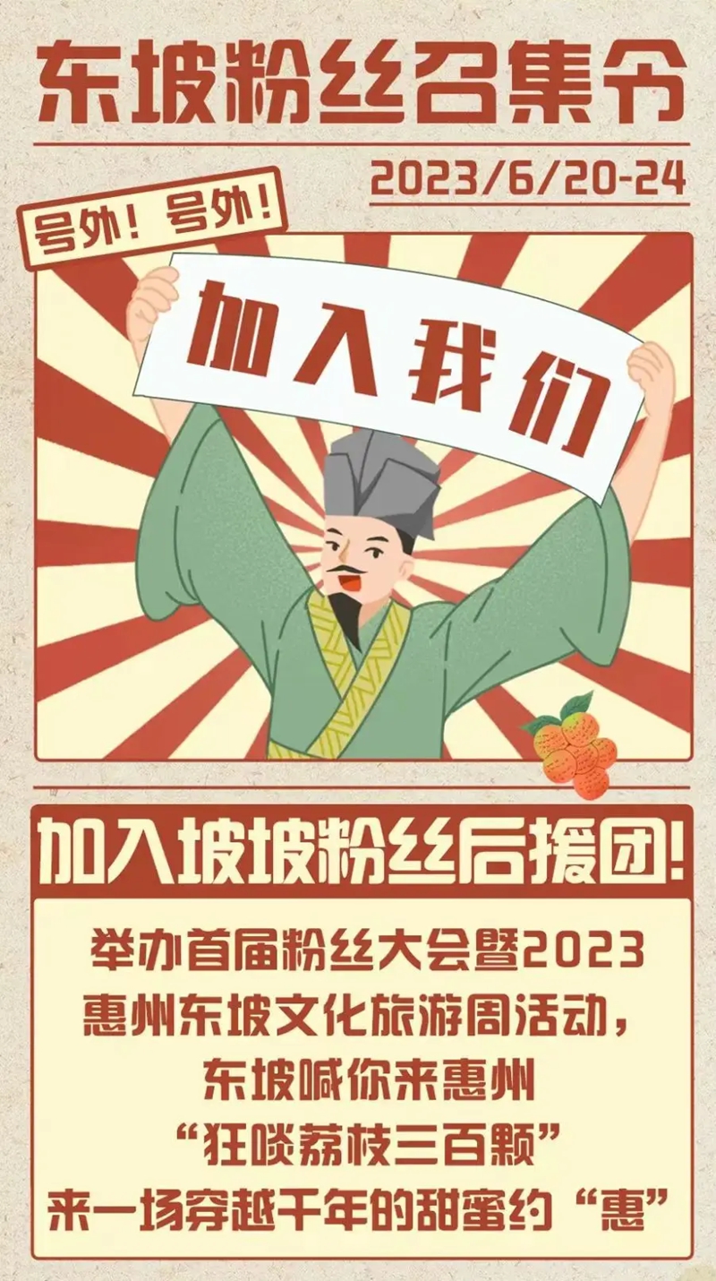 惠州日?qǐng)?bào)訊 (記者龔妍)他是至情至性的北宋大文豪,也是“頂流”吃貨;他是為民造福的“斜杠青年”,也是曠達(dá)灑脫的“樂(lè)天派”……他,就是蘇東坡。首屆東坡粉絲大會(huì)暨2023惠州東坡文化旅游周活動(dòng)將于6月20日至24日舉行,“東坡”喊你來(lái)惠州,來(lái)一場(chǎng)穿越千年的甜蜜約“惠”。