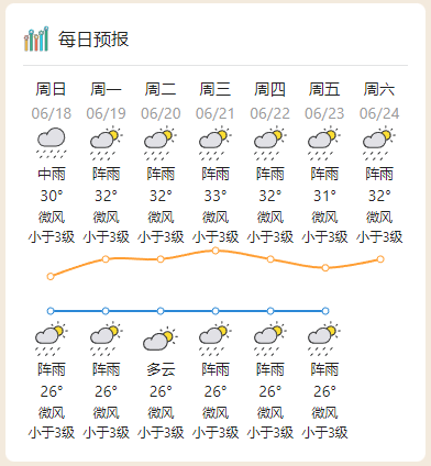 19日,(雷)陣雨局部大雨,最高氣溫32℃左右;
