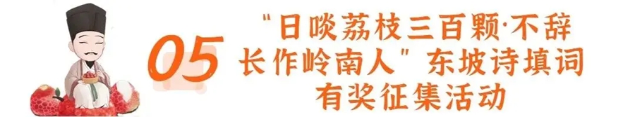 活動(dòng)內(nèi)容:東坡寓惠寫下名詩《惠州一絕/食荔枝》,其中“日啖荔枝三百顆”寫出了東坡因荔枝愛上嶺南,從此“不辭長(zhǎng)作嶺南人”。有獎(jiǎng)?wù)骷顒?dòng)目前已通過省、市媒體平臺(tái)發(fā)出兩項(xiàng)話題征集活動(dòng):以“因什么愛上嶺南”為話題,征集粉絲在推文下方填寫“不辭長(zhǎng)作嶺南人”上聯(lián)內(nèi)容;以“狂炫荔枝三百顆會(huì)發(fā)生哪些趣事”為話題,征集填寫“日啖荔枝三百顆”下聯(lián)內(nèi)容。點(diǎn)贊數(shù)最多的評(píng)論將獲評(píng)“最具人氣獎(jiǎng)”并頒發(fā)榮譽(yù)證書;以動(dòng)畫、漫畫等方式創(chuàng)新填詞的,將有機(jī)會(huì)獲評(píng)“創(chuàng)意填詞獎(jiǎng)”并獎(jiǎng)勵(lì)相應(yīng)獎(jiǎng)金。