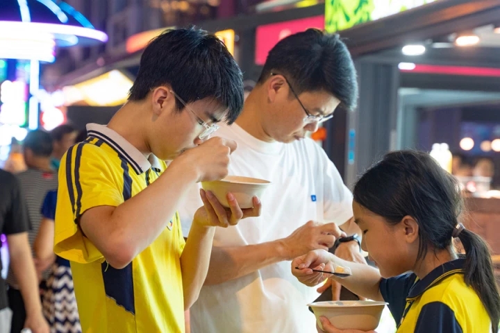 走進(jìn)集市,一股喜慶而熱鬧的氣氛撲面而來。一位身穿華美漢服的女子手持扇子,在古色古香的亭臺下翩然起舞,曼妙的舞姿吸引了眾多觀眾。不遠(yuǎn)處,一群孩子手拿東坡文創(chuàng)雪糕,笑聲響亮,他們在歡樂的氛圍中享受著東坡文化與美食的雙重盛宴。