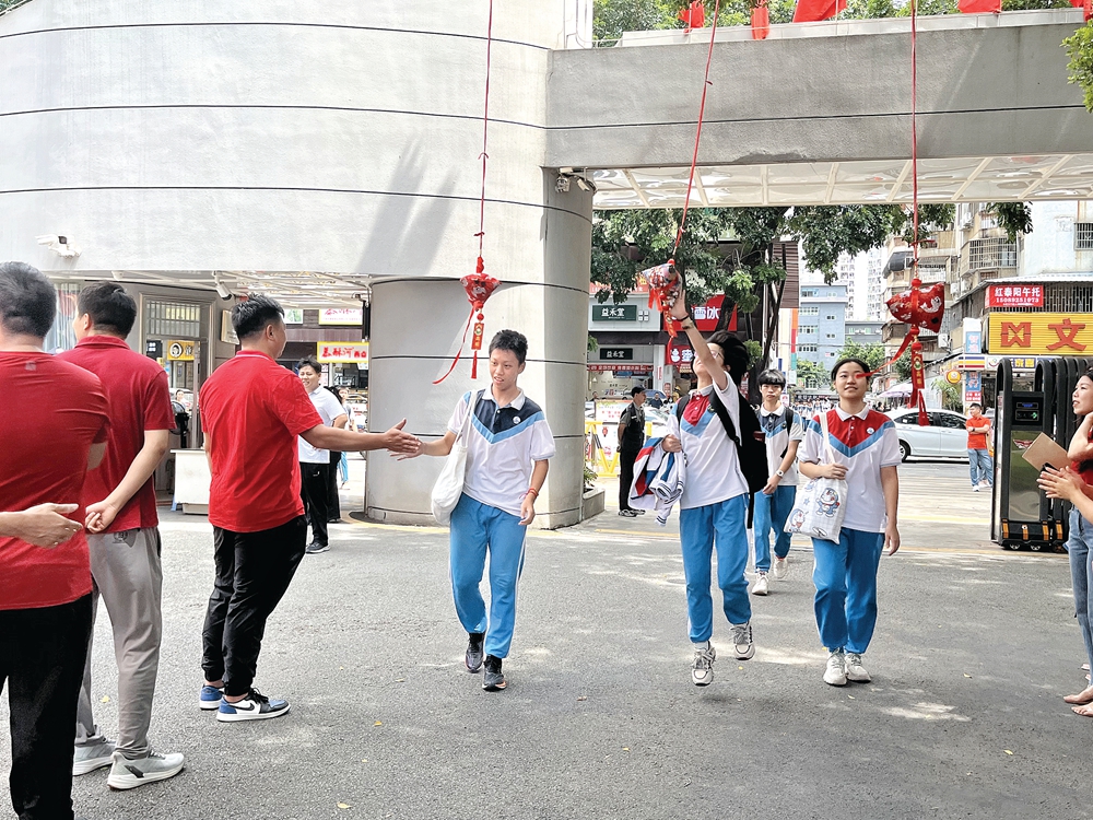 在惠州市第八中學(xué)考點(diǎn),老師們身著紅色上衣,在校門口分列迎接考生。學(xué)校還在校門口懸掛寓意“一舉高中”的粽子,每位考生經(jīng)過(guò)都摸一下,討個(gè)好彩頭。老師們還逐一與考生擊掌,為他們加油打氣。
