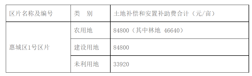 土地補(bǔ)償費(fèi)和安置補(bǔ)助費(fèi)按《惠州市人民政府關(guān)于公布實(shí)施征收農(nóng)用地區(qū)片綜合地價(jià)的公告》(惠府公〔2021〕4號(hào))規(guī)定的惠城區(qū)1號(hào)區(qū)片綜合地價(jià)標(biāo)準(zhǔn)執(zhí)行。