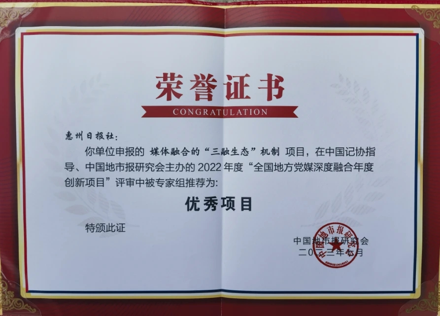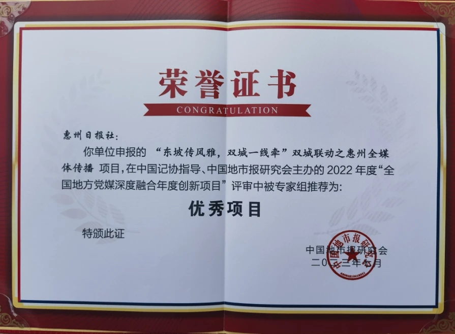 “東坡傳風(fēng)雅,雙城一線牽”雙城聯(lián)動(dòng)入選2022年度“全國地方黨媒深度融合年度創(chuàng)新項(xiàng)目”優(yōu)秀項(xiàng)目。該項(xiàng)目以東坡為紐帶,惠州日報(bào)、眉山日報(bào)聯(lián)動(dòng),全媒體平臺共發(fā)布相關(guān)稿件125篇,總閱讀量超780萬,共39萬名網(wǎng)友“云賞”兩地美景。宣傳形式新、傳播效果強(qiáng)。