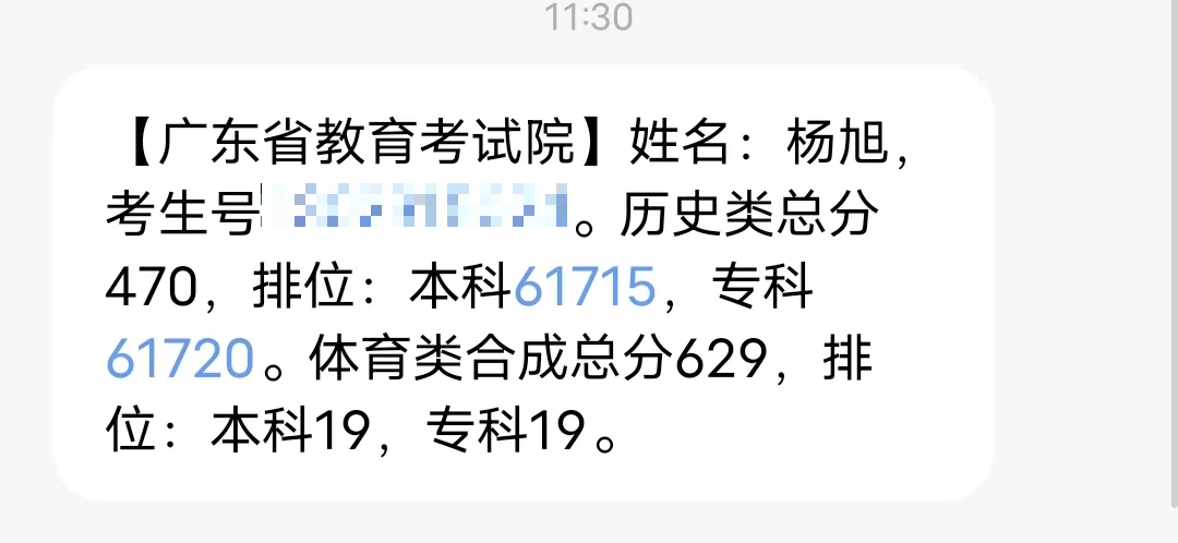 楊旭是惠州市實(shí)驗(yàn)中學(xué)2023屆的體育特長生,在今年的高考中,取得了非常優(yōu)異的成績,廣東體育術(shù)科統(tǒng)考294分,高考總分629分,全省排名19名!