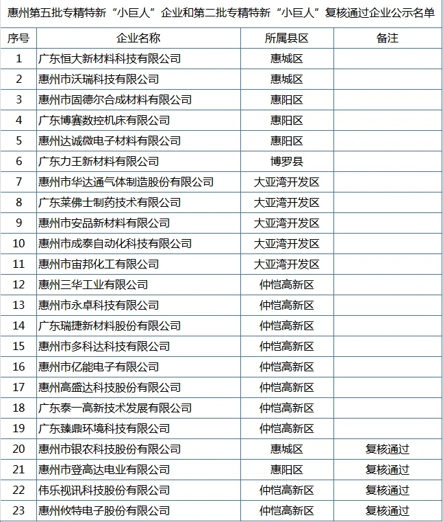 惠州第五批專精特新“小巨人”企業(yè)和第二批專精特新“小巨人”復(fù)核通過企業(yè)公示名單。