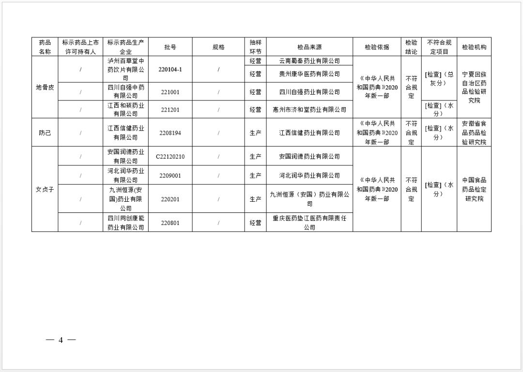 經(jīng)中國食品藥品檢定研究院檢驗(yàn),標(biāo)示為安國潤(rùn)德藥業(yè)有限公司、河北潤(rùn)華藥業(yè)有限公司、九洲恒源(安國)藥業(yè)有限公司、四川同創(chuàng)康能藥業(yè)有限公司生產(chǎn)的4批次女貞子不符合規(guī)定,不符合規(guī)定項(xiàng)目為水分。