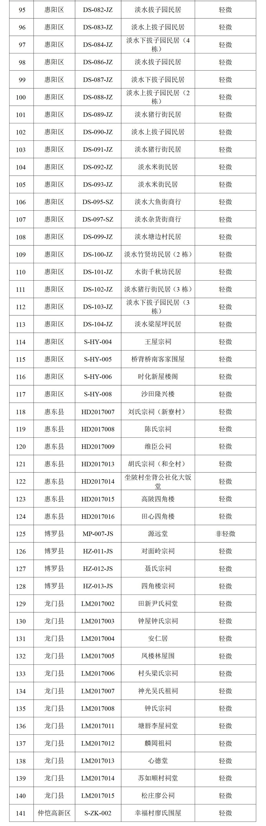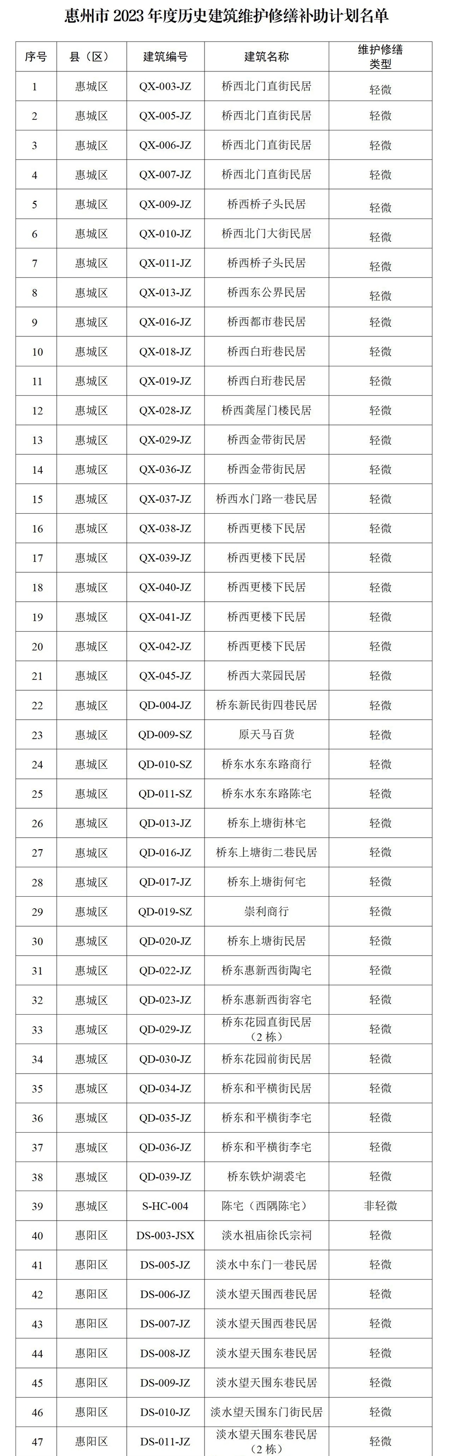 根據(jù)歷史建筑保護(hù)責(zé)任人申請(qǐng),經(jīng)縣(區(qū))核實(shí)和專(zhuān)家論證評(píng)審,市住建局匯總了2023年度擬列入市級(jí)財(cái)政維護(hù)修繕補(bǔ)助計(jì)劃的歷史建筑名單,共有141處歷史建筑列入補(bǔ)助計(jì)劃。141處需修繕的歷史建筑主要集中在惠城區(qū)和惠陽(yáng)區(qū),共有117處。除惠城區(qū)的陳宅(西隅陳宅)以及博羅縣的源遠(yuǎn)堂為非輕微修繕外,其余139處均為輕微修繕。