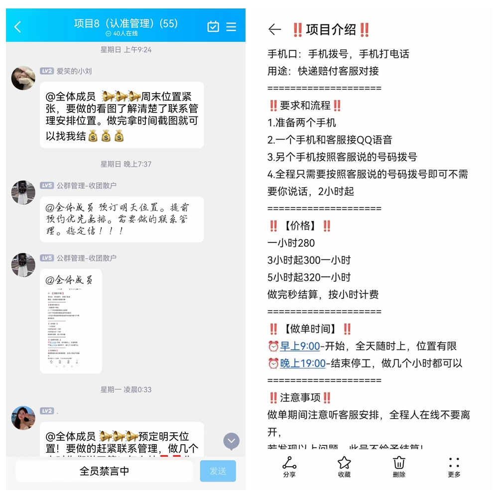 心動的小漫隨即同意,點擊對方發(fā)來的二維碼,進入QQ群后,按照群客服的要求,準(zhǔn)備了兩臺手機,一臺手機負(fù)責(zé)與“客服”打QQ視頻,另一臺手機負(fù)責(zé)撥打電話,電話撥通后,正在QQ視頻的“客服”就開始與電話撥通的用戶通話,通話大致為“您的快遞有破損,故無法送達,現(xiàn)可進行退款”等內(nèi)容,要求通話對端用戶進行操作。
