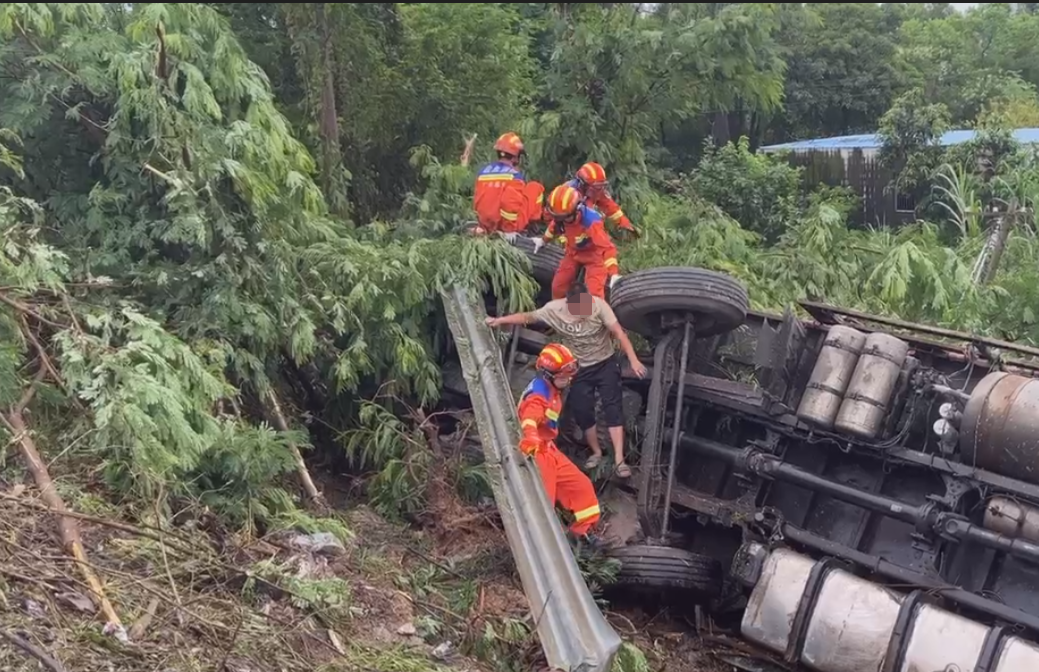 消防員詢問知情人得知,現(xiàn)場為一輛物流貨車沖出護(hù)欄發(fā)生側(cè)翻,車輛有油箱漏油現(xiàn)象,車上人員情況不明。