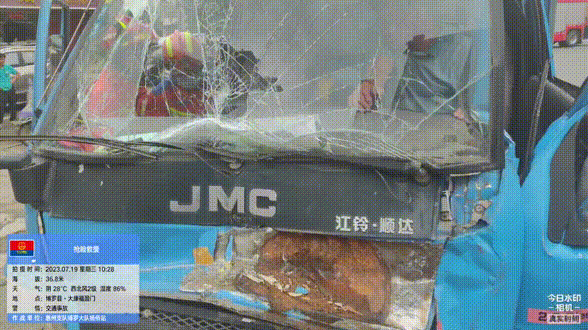 根據(jù)現(xiàn)場情況,現(xiàn)場指揮員立即立即評估救援方案:1名消防員與受困人員進(jìn)行交談,穩(wěn)定受困人員的情緒,確保其積極配合救援;其余隊(duì)員利用液壓擴(kuò)張器對小貨車主駕駛室進(jìn)行破拆、頂撐,擴(kuò)大救援空間。