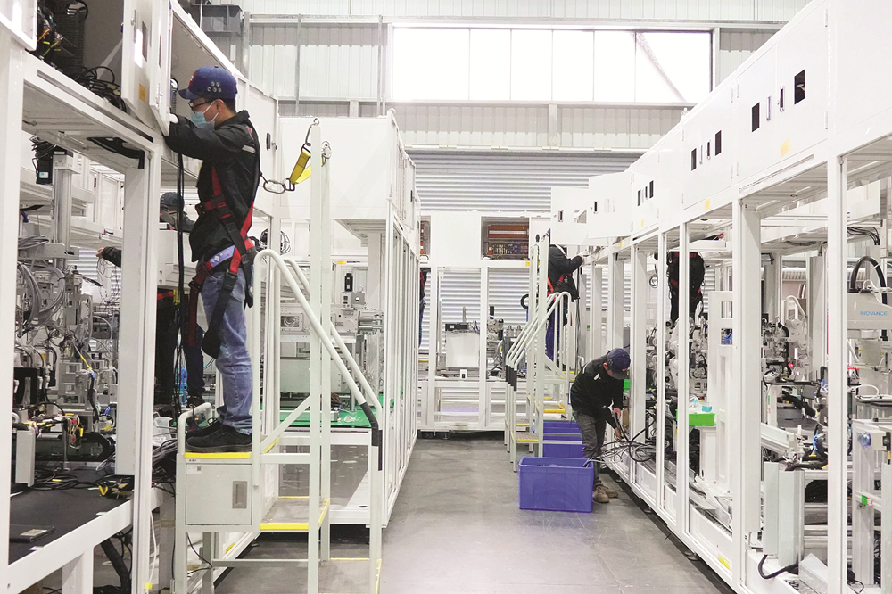 工人在利元亨動(dòng)力電池總裝生產(chǎn)車間作業(yè)。