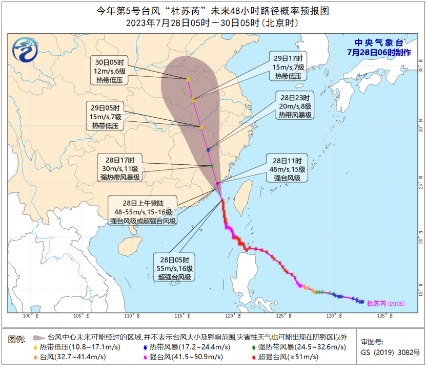 28日08時(shí)至29日08時(shí),巴士海峽、南海東部和南部、臺(tái)灣以東洋面、臺(tái)灣海峽、東海大部,以及臺(tái)灣島及其沿海、福建及其沿海、浙江及其沿海、江西東部、江蘇沿海、上海及其沿海、廣東東部沿海將有5-7級(jí)風(fēng)、陣風(fēng)8-9級(jí),其中南海東北部偏東海域、臺(tái)灣海峽、福建南部的部分地區(qū)及沿海、臺(tái)灣島西部沿海風(fēng)力可達(dá)8-12級(jí)、陣風(fēng)13-15級(jí),“杜蘇芮”中心經(jīng)過(guò)的附近海域風(fēng)力可達(dá)13-16級(jí),陣風(fēng)17級(jí)及以上。