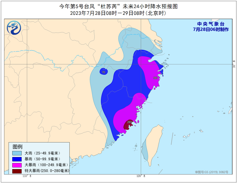 28日08時(shí)至29日08時(shí),江蘇南部、安徽南部、浙江、福建、江西東部、臺(tái)灣島西南部等地的部分地區(qū)有大到暴雨,其中,浙江北部和東部、福建東部等地的部分地區(qū)有大暴雨,局地特大暴雨(250-280毫米)。