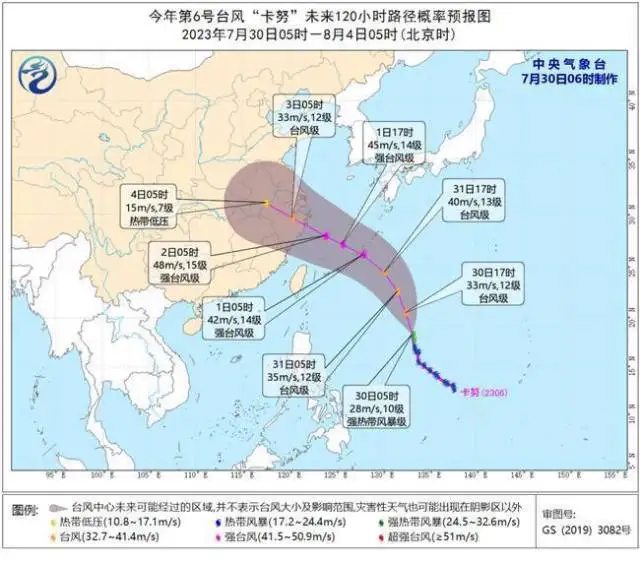 預(yù)計,“卡努”將以每小時20~25公里的速度向北偏西方向移動,31日在琉球群島附近海域轉(zhuǎn)向西北方向移動,31日夜間至8月1日早晨進(jìn)入東海,逐漸向浙江沿海靠近,強(qiáng)度逐漸增強(qiáng),最大強(qiáng)度可達(dá)強(qiáng)臺風(fēng)級(45~50米/秒,14~15級)。