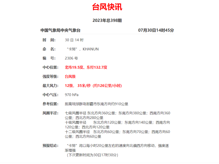 遠(yuǎn)在海上的今年第6號(hào)臺(tái)風(fēng)“卡努”(KHANUN)正在加強(qiáng)!7月30日14時(shí)定位信息來看,“卡努”已晉級為臺(tái)風(fēng)級,其中心附近最大風(fēng)力已達(dá)12級(35米/秒),中心最低氣壓970hPa。