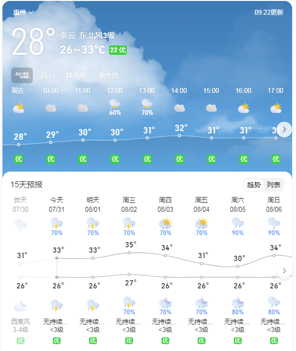 據(jù)惠州市氣象臺(tái)7月31日08時(shí)50分發(fā)布的 【惠州一周天氣趨勢】: