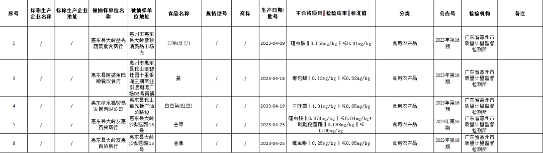 惠東縣大嶺益先蔬菜批發(fā)商行銷售的豆角(豇豆) ,噻蟲胺不符合食品安全國家標準規(guī)定。檢驗機構(gòu)為廣東省惠州市質(zhì)量計量監(jiān)督檢測所。