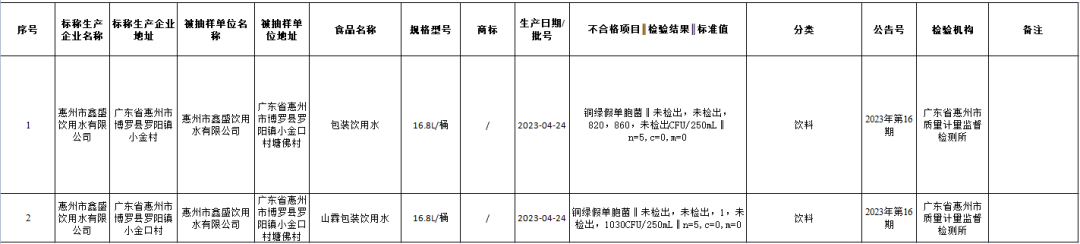 惠州市鑫盛飲用水有限公司生產(chǎn)的山霖包裝飲用水,銅綠假單胞菌不符合食品安全國家標準規(guī)定。檢驗機構(gòu)為廣東省惠州市質(zhì)量計量監(jiān)督檢測所。